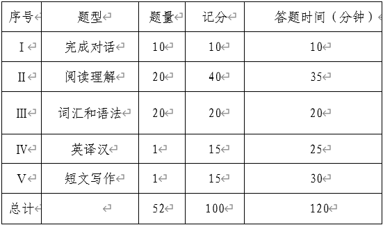 本考试试卷分试卷一和试卷二。试卷一为客观题,包括完成对话、 阅读理解及词汇和语法 3个部分,考试时间为 65 分钟,满分为 70 分; 试卷二为英译汉和短文写作,考试时间为 55 分钟,满分为 30 分。试卷一和试卷二考试时间共计 120 分钟,总分为 100 分。试卷各部分内容和结构如下: