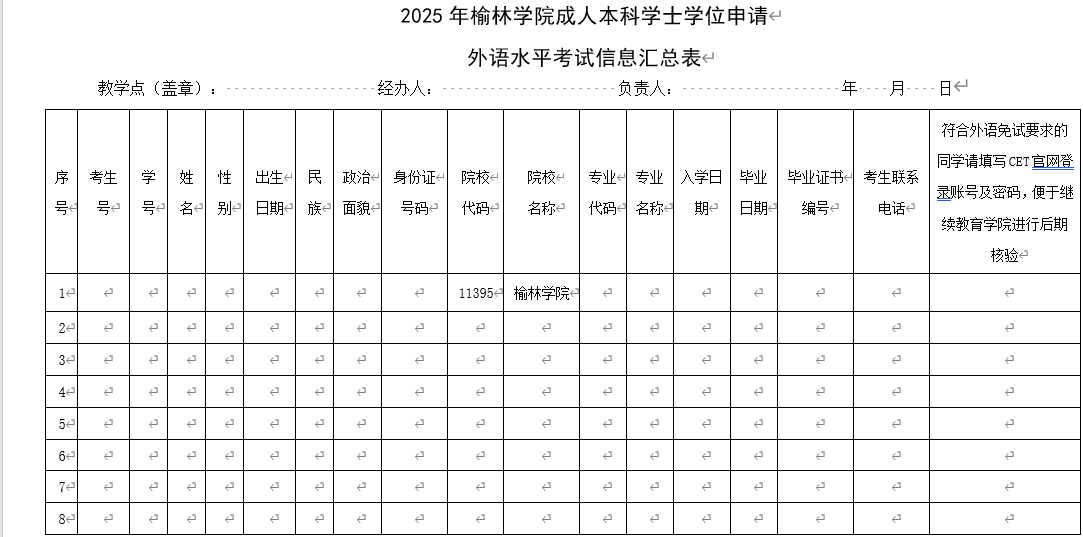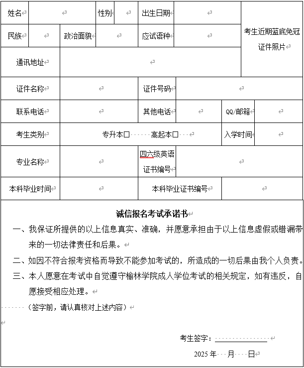 1.2025年榆林学院成人本科学士学位申请外语水平考试报名登记表